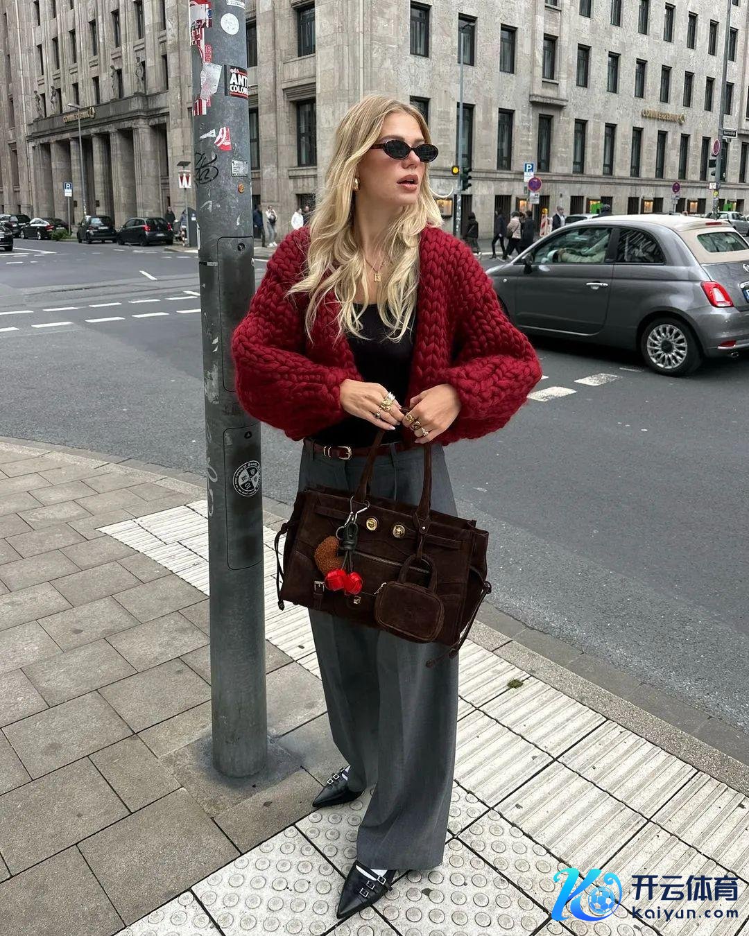 或者是像马想纯这么,一只酒红色的包袋,大概适配衣柜里的许多套造型,尤其不错给冬天常穿的深色单品增添更多出彩细节。