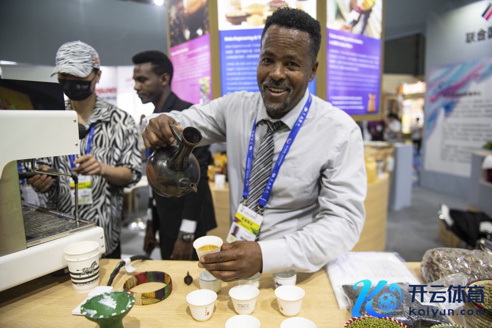 2023年6月29日,在长沙举行的第三届中国-非洲经贸展览会上,参展商阿尔弗莱德·安托尼先容埃塞俄比亚咖啡。新华社记者孙瑞博摄