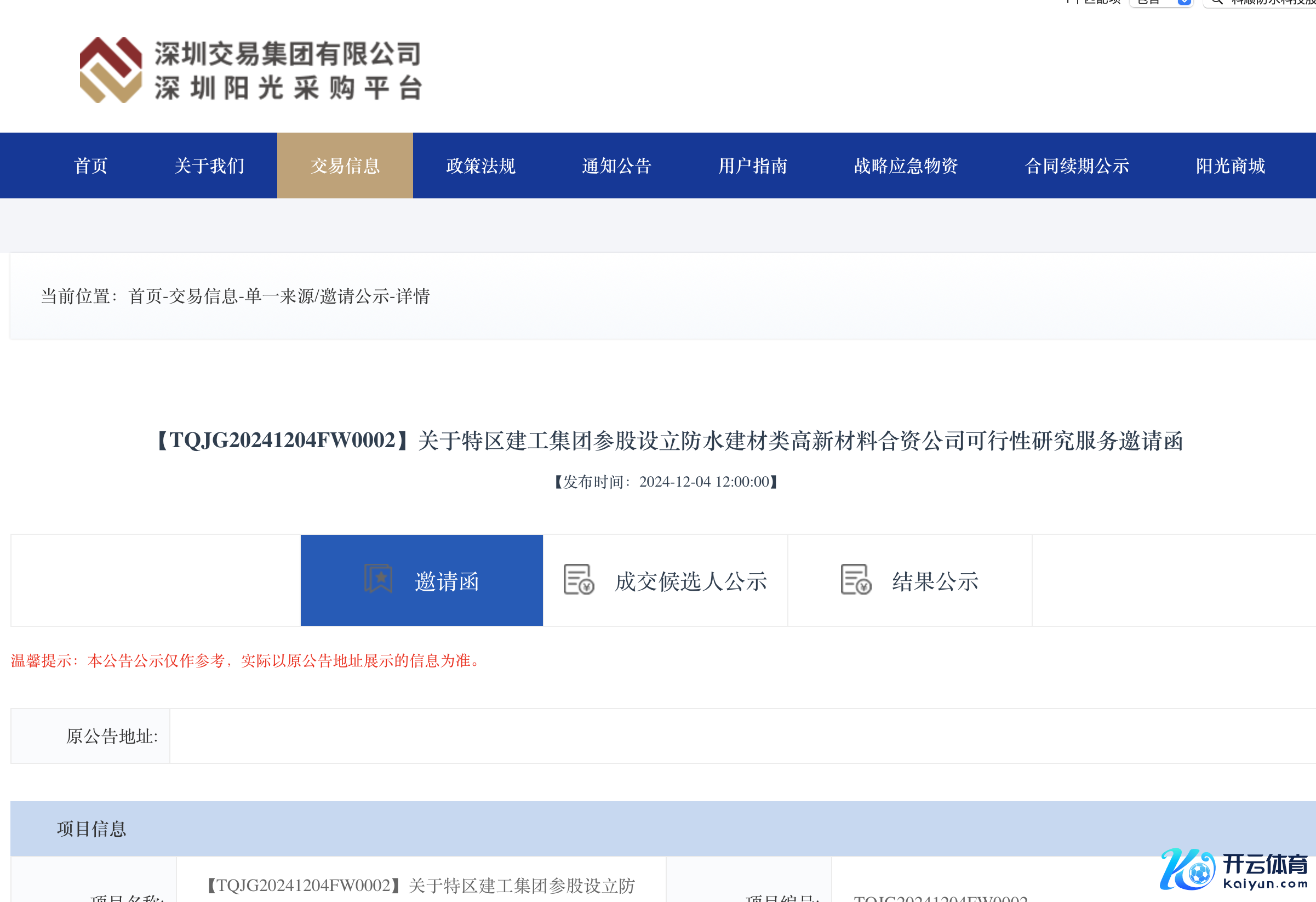 e公司讯,深圳阳光采购平台发布《对于特区建工集团参股成就防水建材类高新材料结伙公司可行性照拂做事邀请函》。特区建工集团拟以参股状貌,与圣戈班(中国)投资有限公司、科顺股份(300737)及深圳市罗湖投资控股有限公司谐和成就防水建材类高新材料结伙公司。由于本方法为集团产业链拓展方法,且属于与非国有经济主体结伙谐和无试验收尾权的方法,具有一定的专科性,特区建工集团拟通过邀请询价采购状貌选聘专科中介机构对该事项开展可行性照拂。