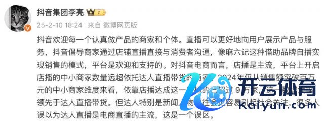 10 日下昼,抖音集团副总裁李亮发文复兴"麻六记开播",暗示:抖音宽饶每一个厚爱作念居品的商家和个体。直播不错更好地向用户展示居品与管事,抖音意见商家通过店铺直播径直与花费者交流,像麻六记这种借助品牌自播达成销售的格式,平台是宽饶和支撑的。