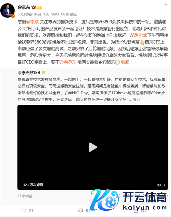发布会贬抑当晚,李斌发博回复并邀请余承东进行爆胎测试,“下昼共事转给我尊界S800前轮爆胎不失控的视频,非常出色,为时刻立异点赞。蔚来ET9上市前也作念了屡次爆胎测试,之前只放了后轮爆胎视频,因为后轮爆胎容易导致车辆甩尾,危境性更大,今天把前后轮同期爆胎视频共享给公共望望。爆胎测试这种事最佳CEO切身上,要不@余承东咱俩安徽老乡约起来。”
