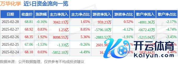 本站音尘,猖狂2025年2月28日收盘,万华化学(600309)报收于68.81元,下落0.16%,换手率0.84%,成交量26.51万手,成交额18.46亿元。