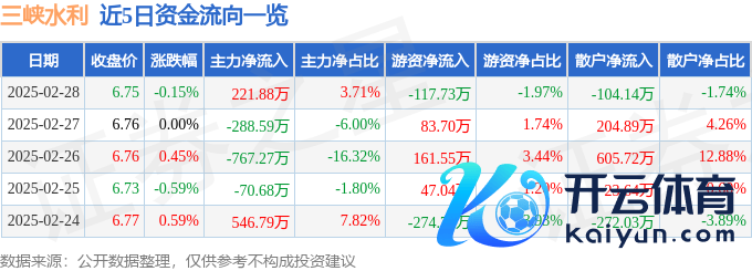 本站音问,截止2025年2月28日收盘,三峡水利(600116)报收于6.75元,着落0.15%,换手率0.46%,成交量8.86万手尊龙凯时体育,成交额5976.56万元。